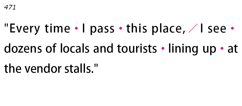 see は第5文型(SVOC)の用法で、Oが dozens of locals and tourists、Cが lining up 。